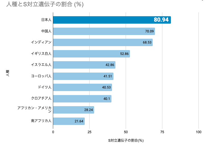 上記グラフを見ると、調べたデータの中ではダントツで日本人のS遺伝子の割合が高い事がわかります。日本人は遺伝的に世界トップクラスで不安感を感じやすい民族である事がよくわかります。
